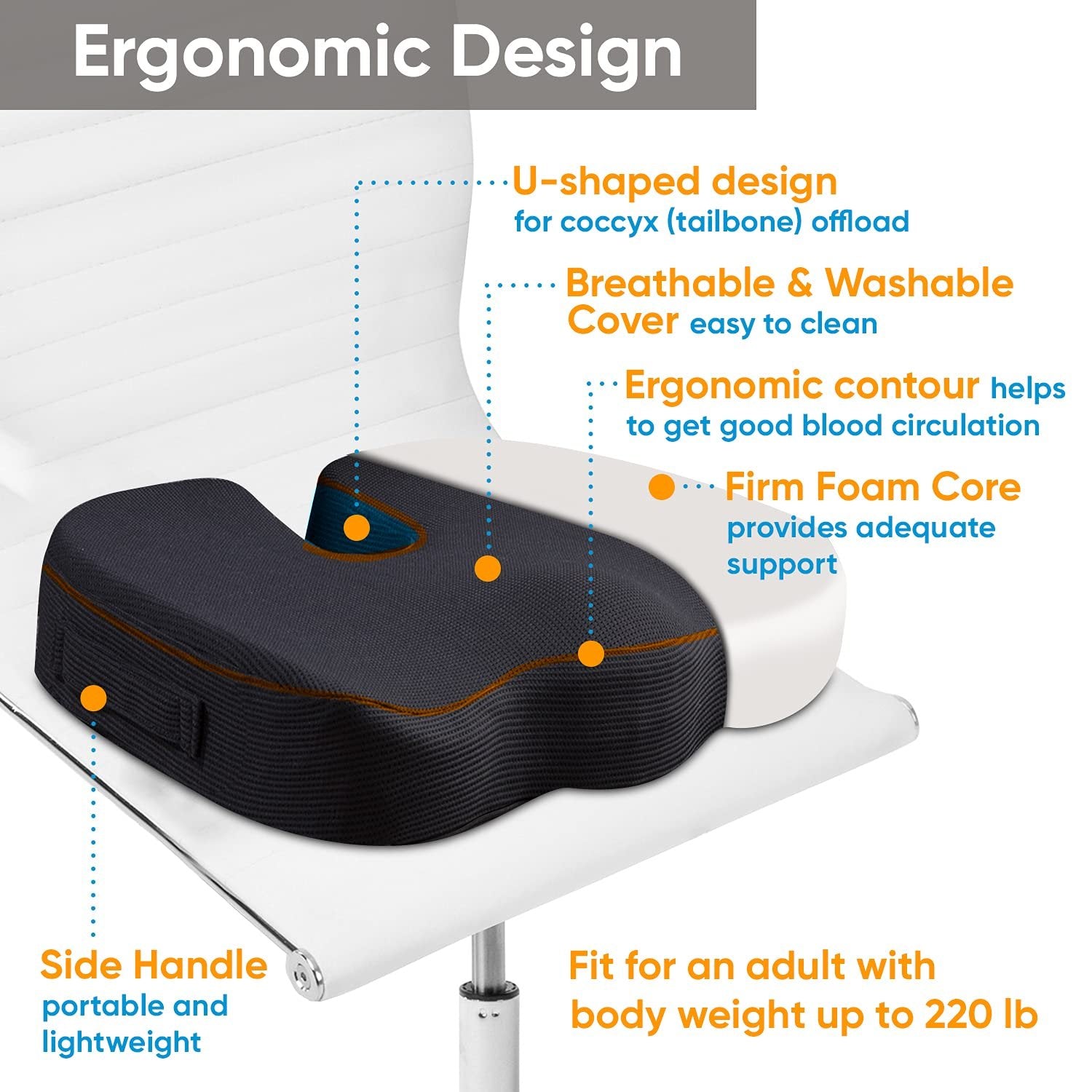 3.Works with Any Chair- This ergonomic seat cushion nicely fits most office chairs. U-shaped contoured design rests your tailbone, avoiding compression. This pillow is also a good option to consider, if you move around a lot. Take it in your car, on a plane or a train. Great for office use, frequent travelers, sporting events and pregnancy. This cushion will help to reduce neck, shoulder, and low back pain. Perfect alternative to donut and hemorrhoid pillows. Best for Adults 150 - 220 lbs