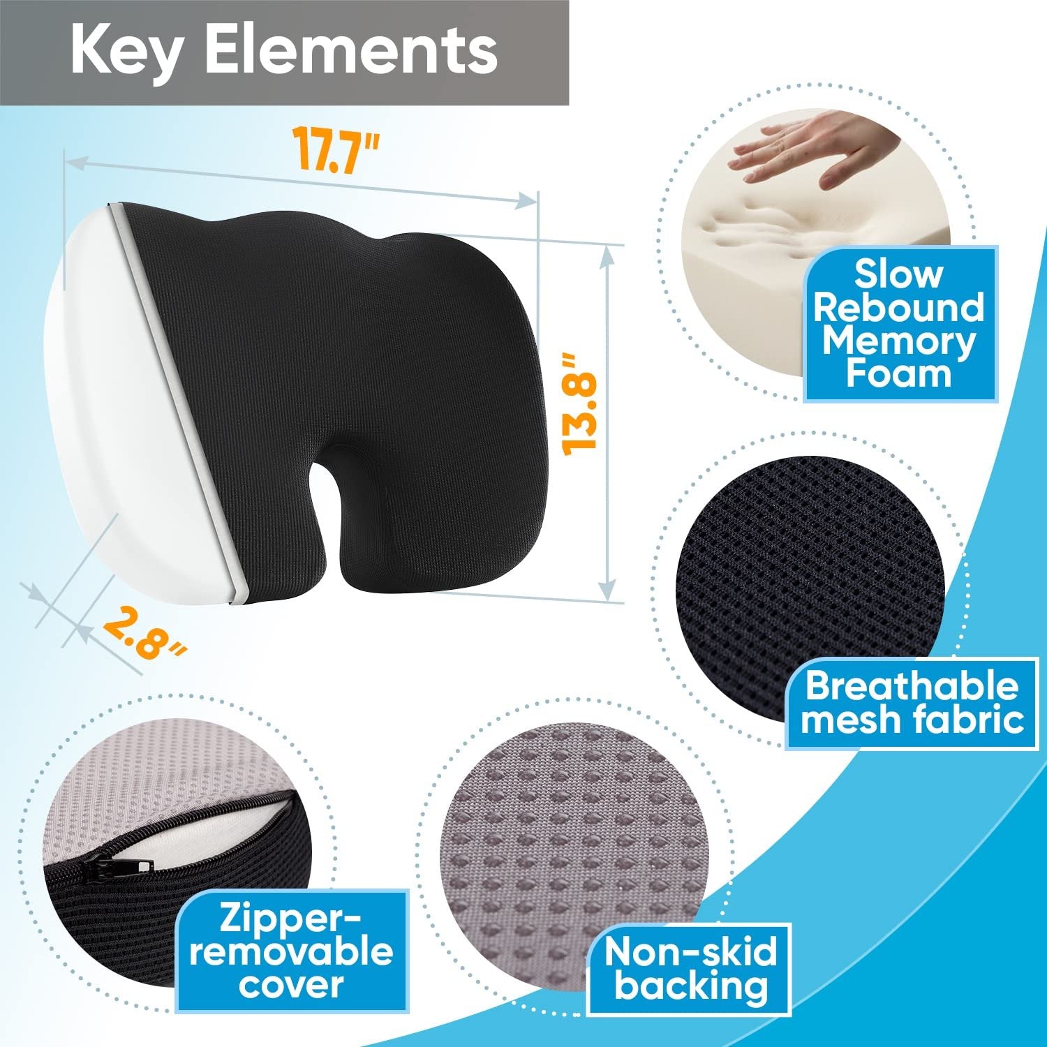 2.High Quality Chair Pad - the butt support pillow comes with a removable and breathable black mesh cover, that provides great air circulation and allows you to sit without feeling hot or sweaty. The non-slip rubber base of the pad securely keeps it in place. The cushion insert is made from Slow Rebound Memory Foam that conforms to your individual shape and helps to avoid pressure. The handle is attached to the side of the pillow, making it easy to take it with you