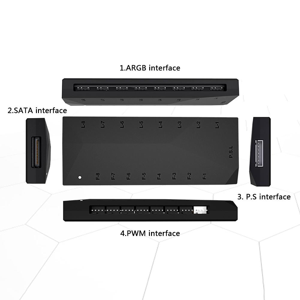 1. 8 groups of PWM power supply + 5V 3-Pin ARGB interface, supports synchronous lighting effects and PWM speed control