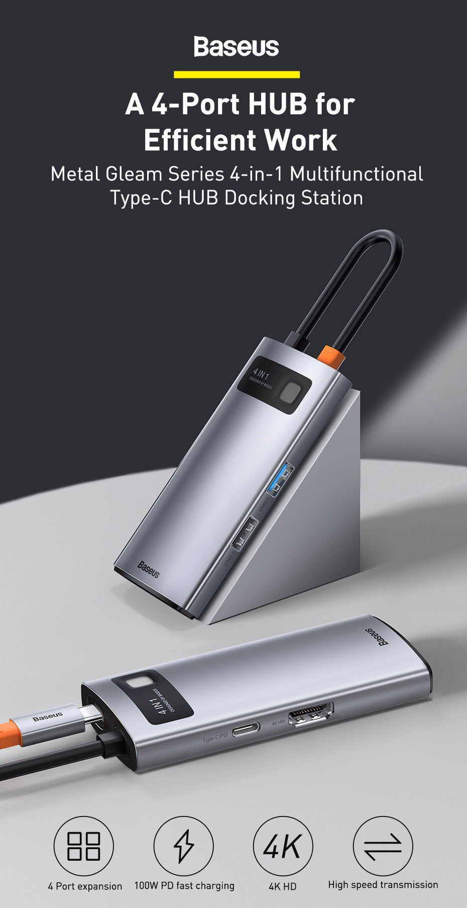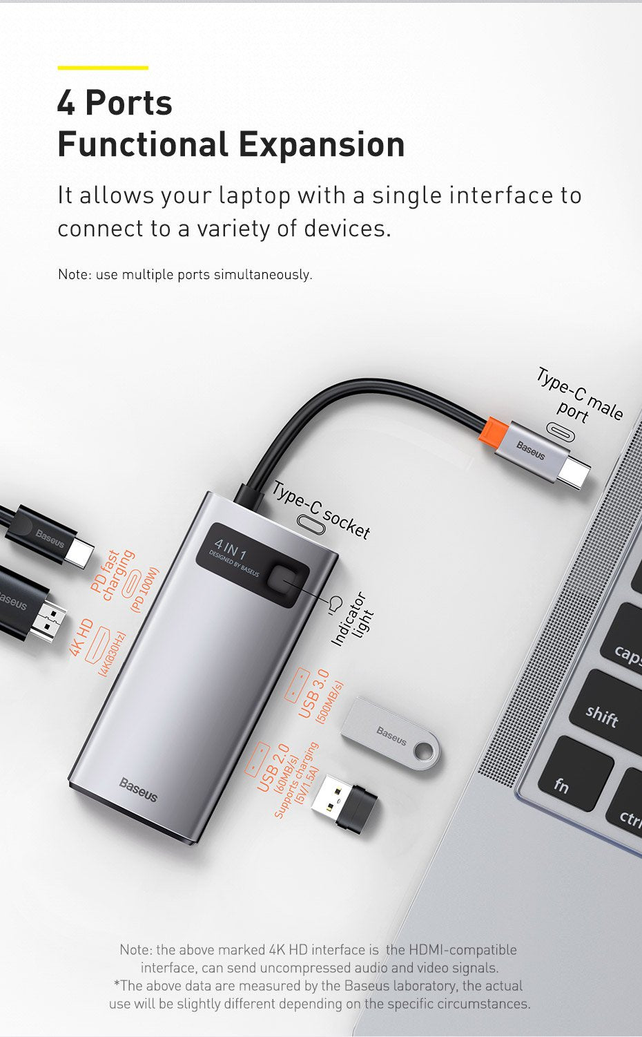 >>>4 in 1 Type-C HUB: PD Fast charging(100W), 4KHDMI-compatible,USB 3.0 , USB 2.0 .