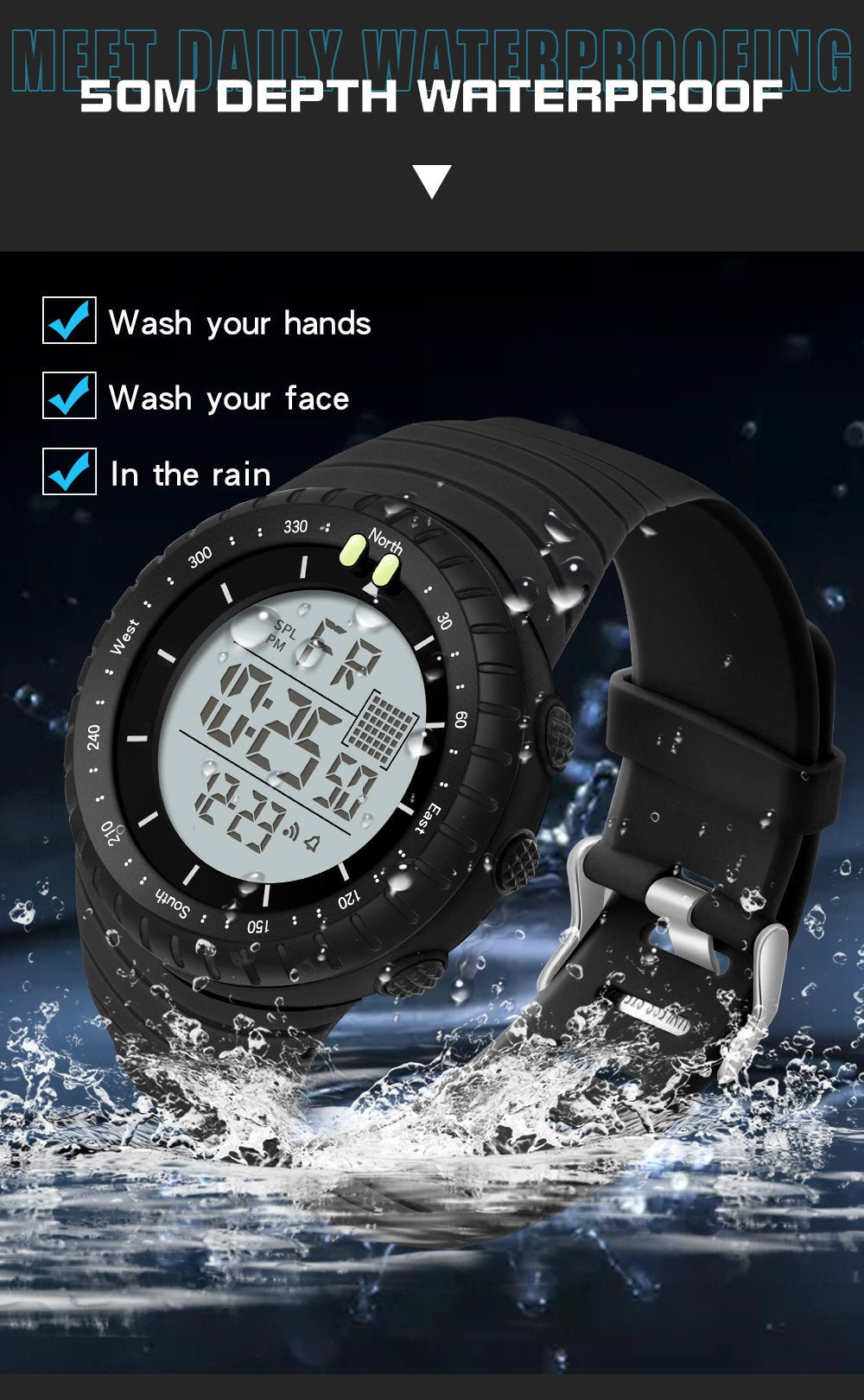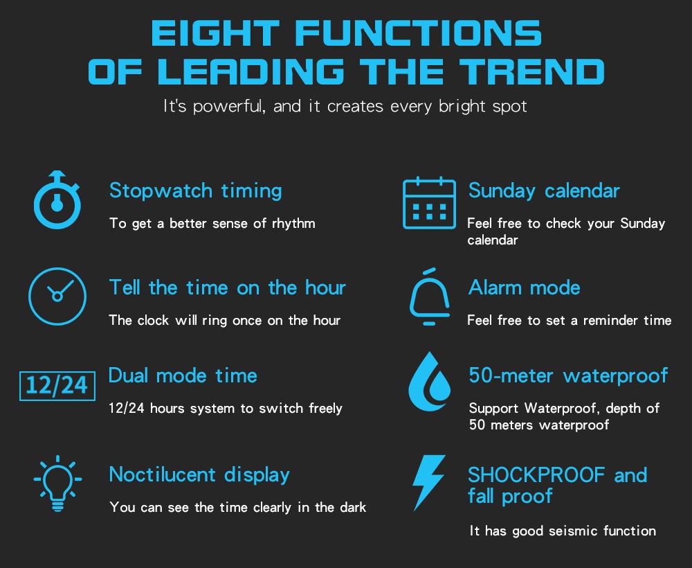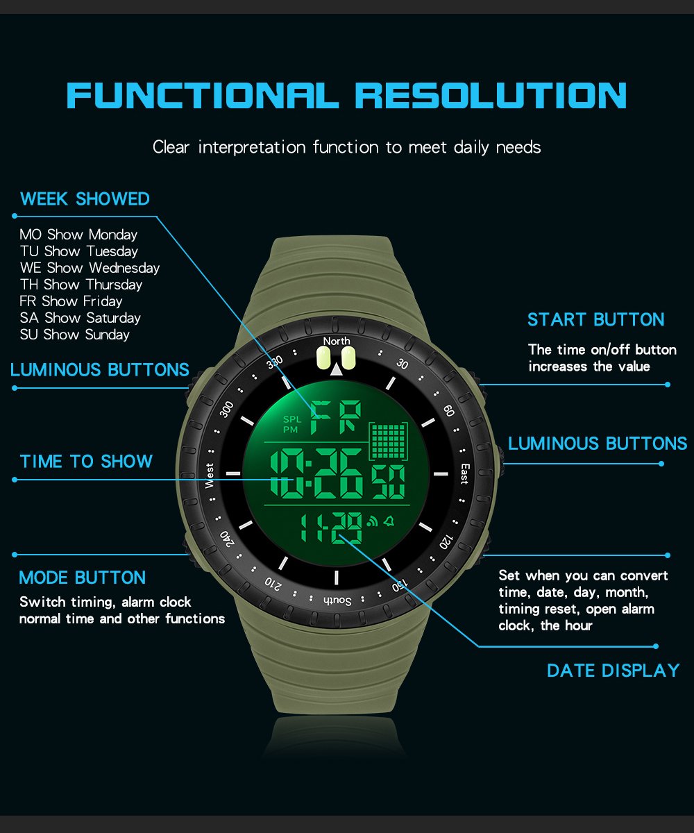Feature : STOP WATCH,Back Light,Shock Resistant,LED Display,Luminous,Auto Date,Diver,Water Resistant,Alarm,swim,Week Display