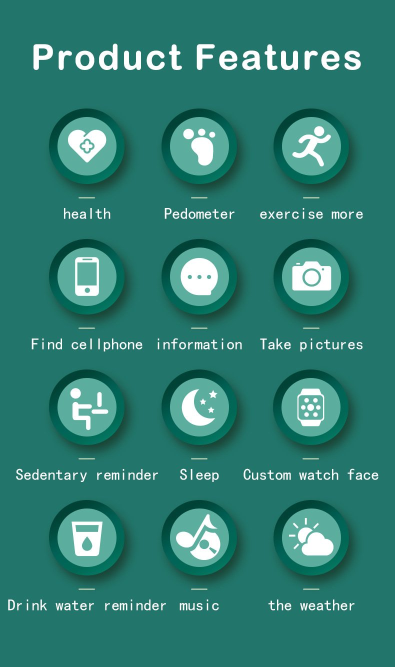 Function : Passometer,fitness tracker,sleep tracker,Message Reminder,Call Reminder,Remote Control,Push Message,24 hour instruction,Alarm Clock,World Time,week,Month,Heart Rate Tracker,Noctilucent,Calendar