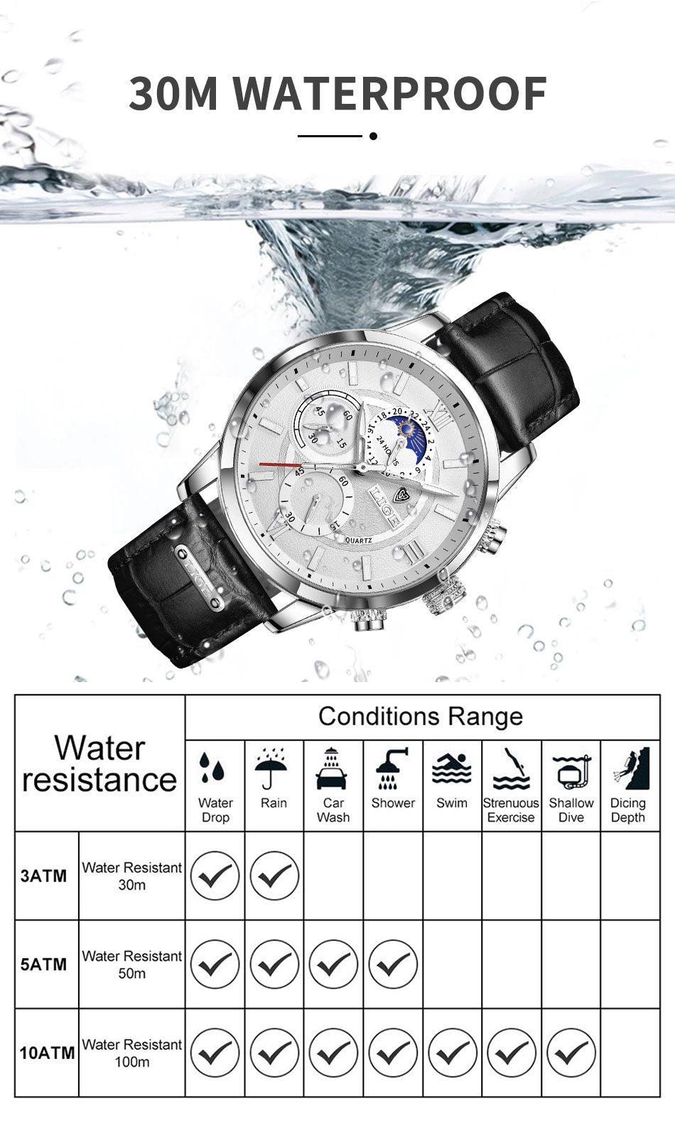 Feature : STOP WATCH,Shock Resistant,Chronograph,Moon Phase,Water Resistant,swim,luminous hands